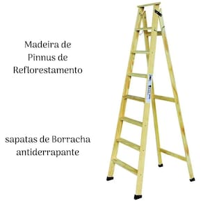 Características: - Nossas escadas são fortes e robustas produzidas de forma a garantir a segurança de quem as utiliza. - Próprias para uso domésticos apta para serviços diversos aonde for necessária. - Toda a madeira é aparelhada e lixada proporcionando um excelente acabamento e qualidade. - Cada degrau suporta até 110 kg de peso total. - Todas as ferragens são galvanizadas, as dobradiças correntes, parafusos e travas de segurança são testadas e aprovadas e de grande durabilidade. - São leves e de fácil manuseio, ideal para as mais diversas utilizações, pinturas, manutenção, eletricidade, limpeza, etc. - Por ser de madeira não conduz eletricidade e por isso ideal para trabalhos com eletricidade. - Fabricadas com madeira de reflorestamento certificada de origem legal são ecologicamente Corretas.