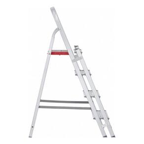 Esta escada de aluminio e ideal para pequenos reparos, pintura e trabalhos externos, suportando uma carga maxima de 120 kg. Com 4 degraus antiderrapantes de 160 mm de largura e altura entre eles de 22 cm, oferece seguranca e estabilidade para o usuario. A escada tem altura total aberta de 1,30 m e dobrada de 1,14 m, facilitando o armazenamento. O design inclui sapatas antiderrapantes e uma trava de seguranca, garantindo maior protecao durante o uso. O material de aluminio, produzido pela propria empresa, assegura durabilidade e leveza, pesando apenas 6,90 Kg. Este produto e certificado pelo Inmetro, atendendo aos requisitos de seguranca. Ideal para uso domestico e profissional, proporciona conforto para quem necessita de estabilidade por periodos prolongados.