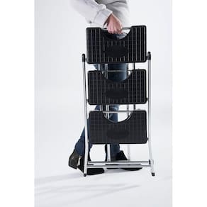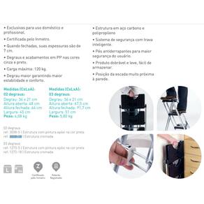As escadas são fabricadas em conformidade com as novas exigências da portaria do inmetro n° 615 (produto certificado) que garante a confiabilidade e resistência de um excelente produto. Tudo para trazer maior segurança aos seus usuários. Foi redesenhada para garantir todo o esforço exigido nos testes no laboratório. Construída em aço-carbono e polipropileno, oferecendo uma grande resistência. Dobrável e leve para fácil armazenamento, a escada pode ser para uso doméstico ou profissional. Possui pés antiderrapantes e degraus amplos, possibilitando maior conforto e segurança ao utilizá-la. Com 3 degraus e suportando uma carga máxima de 120 kg, a escada é uma adição prática para as suas ferramentas.