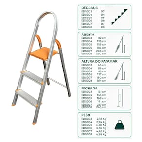 Escada Doméstica de Alumínio com Acessórios em Polipropileno 7 Degraus Antiderrapantes - EDS007 - AGATA Descrição: Escada Doméstica de Alumínio com Acessórios em Polipropileno 7 Degraus Antiderrapantes. Características: - Patamar e acessórios em polipropileno - Fita de segurança - Sapatas antiderrapantes - Carga máxima de até 120 Kg Instruções de Uso: - Atenção: Este produto é para uso exclusivamente não continuado, geralmente ligado à atividade doméstica - Atenção: Este produto não foi projetado para uso continuado, geralmente ligado à atividade semi-profissional, profissional ou industrial - Guarde este manual de instruções para eventual consulta - Antes de utilizar a escada, verifique as condições do produto - Observe o peso máximo suportado pela escada - Não use em piso escorregadio ou irregular - Não utilize a escada por duas pessoas simultaneamente - Não utilize a escada próximo a redes elétricas - Não utilize a escada com calçados deslizantes - Descarte a escada se trincada, quebrada, desgastada, avariada, exposta ao fogo ou à corrosão química Certificação Inmetro: 003692/2023 *Imagens meramente ilustrativas.