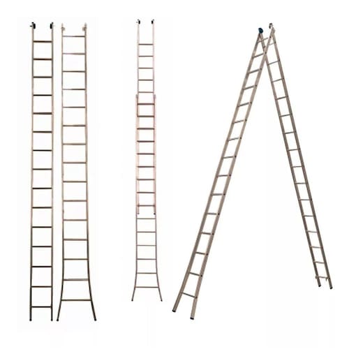 Escada 3 em 1, permitindo a utilização em 3 formas (articulada, separada e estendida). Possui pés e degraus antiderrapantes, com os pés prensados nos perfis de alumínio, evitando que escapem. Conta com degraus ligeiramente maiores e com curvatura para os dois lados, mantendo o coeficiente de segurança e oferecendo mais conforto durante o uso.