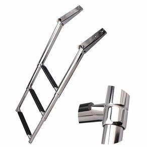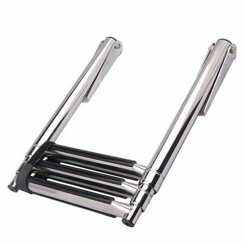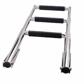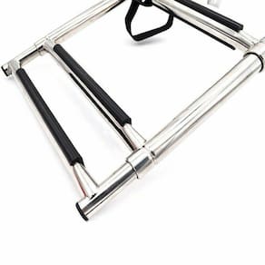 compacta e de Fácil instalação, a escada com 3 degraus para embarcações é feita 100% em INOX 316 polido de alto brilho com degraus revestidos em borracha antiderrapante para dar mais segurança ao subir ou descer da embarcação. A Haste de fixação ao casco possui articulação de até 270, que permite guardar a escada enquanto navega. Seus degraus são retráteis e possui cinta de segurança para prendê-los, deixando a escada super compacta para ser guardada.