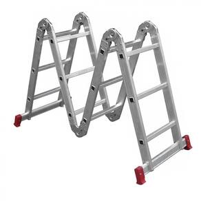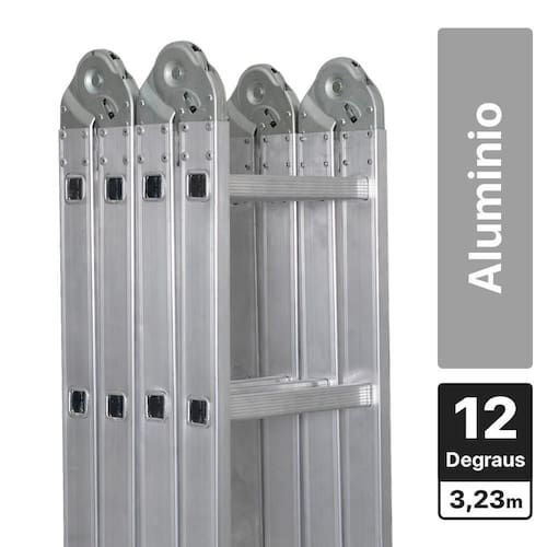 Produto: Escada multifuncional de alumínio 4 x 3 com 12 degraus 13 em 1 - ESC0292Marca: RottermanDescrição: A Escada multifuncional de alumínio 4 x 3 com 12 degraus 13 em 1 ESC0292 da Rotterman é extremamente versátil, leve e fácil de transportar. Pode ser usada como escada de encosto, escada de pintor em A, andaime e outras dez posições. Suas articulações tem travamento automático. Possui extensão lateral para maior estabilidade, degraus antiderrapantes com maior área de contato, sapatas emborrachadas, e sua carga máxima de trabalho é de 150 KgCaracterísticas: • Material: Alumínio• Capacidade: 150 Kg• Escada extensiva: 12 degraus• A escada articulada 3 x 4 possui 4 partes com 3 degraus• Na posição 10, recomenda-se o uso de plataforma para melhor distribuição do peso.Especificações: Material: AlumínioCapacidade: 150 KgEscada extensiva: 12 degrausAltura máxima m : 3,23Altura fechada m : 0,89Altura formato pintor m : 1,45Altura andaime m : 0,87
