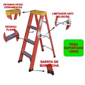Escada Tesoura 1.2m Alumínio/Fibra 4 degraus WBertolo TAF 4 Escadas profissionais de alta performance Por não serem condutoras de energia, são ideais para trabalhos que envolvam eletricidade. De fácil manuseio, suportam carga máxima em todos os modelos de 120 kg/136 kg, com exceção da banqueta - 150 kg, e contribuem também para a segurança em atividades de telecomunicação, manutenção, pintura, trabalho em altura, instalações, dentre outras. Todas são de uso em baixa e média tensão com alto padrão de qualidade da marca que você já conhece. - Especificações Técnicas: Modelo: Profissional TAF 4 Peso: 4,50 Kg Material: Alumínio E Fibra Altura: 1,20 Metros Número De Degraus: 3 Degraus + 1 Patamar Carga Máxima De Trabalho: 120Kg As escadas Tesoura TAF são escadas em formato A, compostas por duas partes. A parte frontal possui os degraus de alumínio planos com frisos antiderrapantes. A parte traseira que serve apenas de apoio, onde não há acesso para a utilização. Essas escadas são leves, com baixa absorção de água e não condutoras de eletricidade. Ideais para uso industrial, comercial e doméstico. Fabricação São fabricadas em Perfil U em fibra de vidro por processo de pultrusão e degraus planos em alumínio com frisos antiderrapantes, proporcionando maior conforto e segurança em sua utilização. São fabricadas conforme a norma ABNT/NBR 16308. Padronização: Sapatas de borracha patamar para apoio de ferramentas limitador de abertura antibeliscão etiquetas para sua identificação. Composição Alumínio Fibra de Vidro Borracha Polipropileno Informação Carga máxima de trabalho de 120 kg Leves e duráveis Resistentes Não condutora de eletricidade Essas escadas permitem 100% de manutenção O patamar da escada não é considerado um degrau útil. Marca: Não Informado