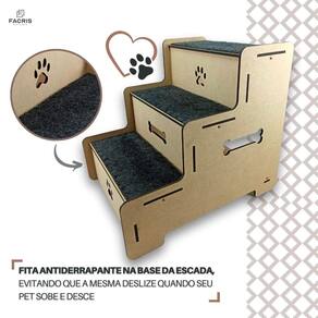 Escadinha pet escada para cães degraus antiderrapantes Estamos entre os melhores vendedores desta loja. Tenha tranquilidade de comprar com quem está disposto a te oferecer o melhor atendimento. Temos a missão de garantir a sua satisfação total, tanto nos produtos quanto no atendimento. Assim estabelecendo uma relação de confiança Qualquer dúvida nos mande uma pergunta ou clique em: ver mais anúncios do vendedor Escada 3 degraus para pet Dê ao seu pet a liberdade ao se pet de subir e descer da cama ou sofá com a segurança que ele merece. Sabemos que o impacto ao descer de lugares altos podem causar vários problemas de saúde a ele como problemas nas articulações e ossos. pensando nisso desenvolvemos escadas seguras para você evitar esse tipo de problema em seu pet. os degraus são revestidos com carpete e são feitos em 6 mm. Na parte de baixo acompanha fita de aderência para que a escada fique estável quando seu pet sobe ou desce. Observação: o produto é enviado desmontado, acompanha manual de instruções detalhado e parafusos para a montagem. Diferenciais do produto Escada reforçada e montada com parafusos; Tapete antiderrapante; 100% mdf mais qualidade e segurança; Mesmo material na fabricação de móveis sob medida Dupla camada de melamina com resistência e acabamento premium; Parafusos e fixação resistentes com capacidade de até 5kg por prateleira; Somos fabricantes dos nossos produtos O envio do seu pedido é nossa prioridade e além de fazermos seu produto com o máximo de carinho e qualidade, despachamos o mais rápido possível. Especificações do produto - altura: 46 cm - largura: 40 cm - profundidade: 50 cm - altura dos degraus: 14 cm - largura dos degraus: 17 cm - número de degraus: 03 - estrutura degraus: mdf 6 mm - revestimento: melamina - acompanha kit para de instalação. Instalação A instalação é bem simples, basta acompanhar o passo a passo do manual Limpeza / manutenção Para limpeza, utilize apenas um pano umedecido com água sem produtos químicos para garantir a durabilidade. total: Todos nossos produtos contam com contra defeitos de fabricação. Atenção: As cores do produto podem variar de acordo com o monitor, a iluminação do ambiente ou sua percepção visual. As imagens ambientadas são meramente ilustrativas e podem apresentar itens que não compõe o produto. Dúvidas Se tiver alguma dúvida ou não tiver encontrado o que você procura, fique à vontade para utilizar o campo de perguntas. Responderemos o mais rápido possível.