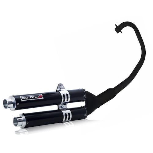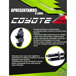Escapes esportivos de alta performance, com design exclusivo COYOTE com duas saídas paralelas.Confeccionados em tubos de alumínio polido ou preto, fixados em curva do motor ( ou acoplamento em alguns casos ) feita em aço carbono preto.Substitui o escape. Proporciona à moto ronco inigualável, grosso e grave (estilo competição). Melhora o desempenho em médios e altos RPM's.