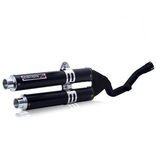 Escapes esportivos de alta performance, com design exclusivo COYOTE com duas saídas paralelas.Confeccionados em tubos de alumínio polido ou preto, fixados em curva do motor ( ou acoplamento em alguns casos ) feita em aço carbono preto.