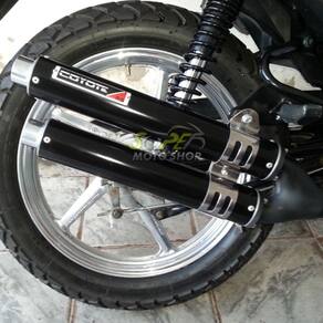 Escapes esportivos de alta performance, com design exclusivo COYOTE com duas saídas paralelas.Confeccionados em tubos de alumínio polido ou preto, fixados em curva do motor ( ou acoplamento em alguns casos ) feita em aço carbono preto.Substitui o escape. Proporciona à moto ronco inigualável, grosso e grave (estilo competição). Melhora o desempenho em médios e altos RPM's.