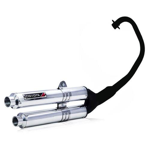 Escapes esportivos de alta performance, com design exclusivo COYOTE com duas saídas paralelas.Confeccionados em tubos de alumínio polido ou preto, fixados em curva do motor ( ou acoplamento em alguns casos ) feita em aço carbono preto.Substitui o escape. Proporciona à moto ronco inigualável, grosso e grave (estilo competição). Melhora o desempenho em médios e altos RPM's.