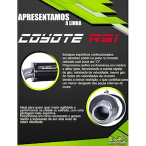 A linha de escapamentos COYOTE RS1 foi desenvolvida em formado redondo com a no formato de "O".Desenvolvido pela equipe de engenharia mecânica e designers, a linha garante melhor desempenho, ronco estilo espotivo e grave. Disponível em duas cores: polido e preto. O modelo é fábricado para diversos modelos de moto. Ponteiras produzidas em alumínio e curva em aço carbono, garantem a qualidade padrão Coyote ao produto.Dentro da embalagem acompanham a curva ou coletor em aço carbono, ponteira, cinta/abraçadeira e todos os parafusos, tuchos e itens necessários para realizar a devida instalação na qual recomendamos que seja feita por um profissional da área.