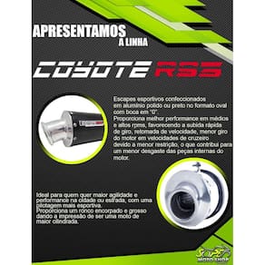 Escapes esportivos confeccionados em alumínio polido ou preto no formato oval com boca em "0". Proporciona melhor performance em médios e altos rpm's, favorecendo a subida rápida de giro, retomada de velocidade, menor giro do motor em velocidades de cruzeiro devido a menor restrição, o que contribui para um menor desgaste das peças internas do motor.Ideal para quem quer maior agilidade e performance na cidade ou estrada, com uma pilotagem mais esportiva. Proporciona um ronco encorpado e grosso dando a impressão de ser uma moto de maior cilindrada.