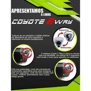 A linha de escapamentos COYOTE 2 Way e 2 Way + foi desenvolvida em formado tri-oval e possuí o sistema exclusivo de alternância de ronco entre silencioso e esportivo.