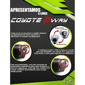 Trata-se de um exclusivo e inédito sistema de alternância de ronco esportivo e silencioso no mesmo escapamento. O sistema Coyote 2 Way é único no mundo pela sua facilidade, em menos de 5 segundos você muda o ronco para esportivo ou silencioso, pela sua praticidade, você não precisará de ferramentas específicas para essa mudança, e pela sua segurança, você não tem contato com a peça, evitando queimaduras caso a peça esteja quente.