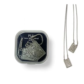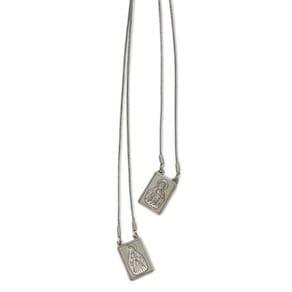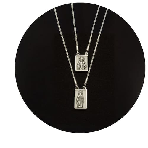 Escapulário confeccionado em aço inoxidável, resistente e durável, com pingentes retangulares contendo imagens religiosas detalhadas. Acompanha caixinha para armazenamento e conservação, ideal para uso pessoal ou para presentear.