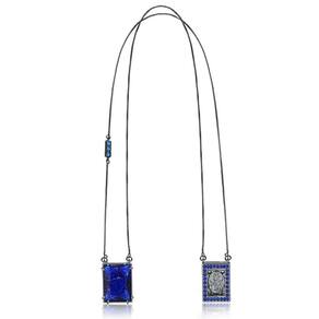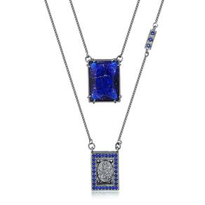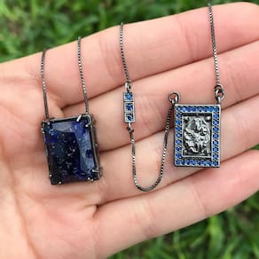 Características do Escapulário Banhado a Ródio Negro com Pedra Safira Fusion Escapulário Banhado a Ródio Negro Pingente Pedra Safira Fusion com 2 cm x 1,5 cm Corrente com 63 cm de comprimento