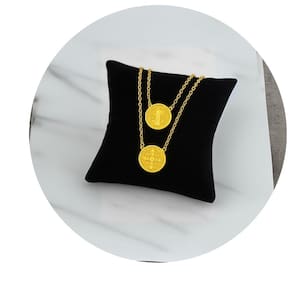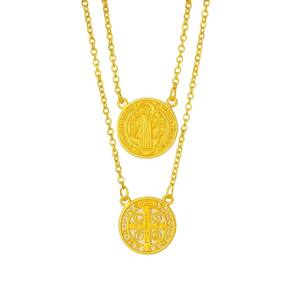 Escapulário confeccionado em aço inox dourado, com duas medalhas de São Bento em alto relevo, trazendo símbolos de proteção e fé. Possui corrente com 27,4 cm de comprimento, resistente e de acabamento brilhante, ideal para uso diário. Uma joia de significado especial, perfeita para expressar devoção e estilo.