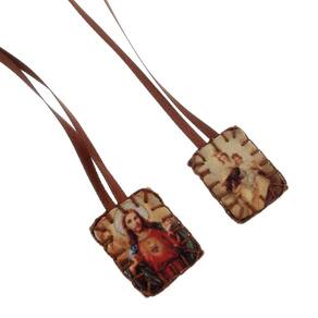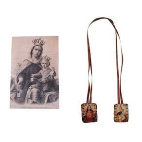 Este belo escapulário de feltro tamanho (P) com imagem de Nossa Senhora do Carmo e Sagrado Coração de Jesus e fita de cetim na cor marrom. O produto vem acompanhado de um livreto de orações.