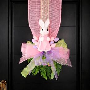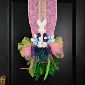 Deixe sua decoração de Páscoa ainda mais encantadora com este lindo escapulário decorativo com casal de coelhos e laço. Ideal para enfeitar portas, paredes e entradas, ele traz delicadeza e charme ao ambiente, criando uma recepção acolhedora para familiares e visitantes