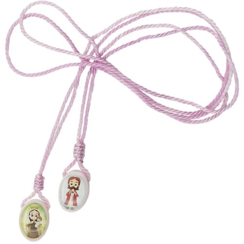 Escapulário Rosa Menina infantil Nossa Senhora do Carmo Este Escapulário Infantil traz em uma ponta a imagem infantilizada de Nossa Senhora do Carmo, e na outra o Coração de Jesus, e é acompanhado de um encarte com a oração. Feito em cordão na cor rosa claro, madeira e adesivo colorido, medindo 32 cm de comprimento, o uso deste escapulário é uma forma de evangelizar as crianças e ensiná-las sobre a importância de se consagrar à proteção de Nossa Senhora e de se alimentar do amor temente a Deus.