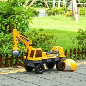 Construída em plástico durável e atóxico, este brinquedo prioriza a segurança enquanto resiste ao uso diário. Inclui um capacete de segurança para proteger os pequenos usuários e um amplo compartimento de armazenamento sob o assento para manter brinquedos e pequenos objetos organizados. A escavadeira é impulsionada pelos movimentos das pernas da criança, promovendo atividade física e coordenação, sem necessidade de baterias para o movimento do veículo. Contudo, 3 pilhas AA são necessárias para alimentar as luzes e a música.