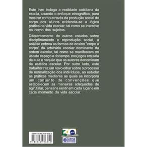 Este livro indaga a realidade cotidiana da escola, usando o enfoque etnográfico, para mostrar como através da produção social do corpo dos alunos evidencia-se a lógica prática da vida escolar, tal como se inscreve no corpo dos sujeitos. Diferentemente de outros estudos sobre disciplinamento e reprodução social, a análise enfoca as formas de ensino corpo a corpo do arbitrário escolar dominante da ordem escolar, tal como se manifestam no uso do espaço e do tempo, nos jogos em sala de aula e naquilo que os autores denominam de estética escolar. Por outro lado, este trabalho traz um novo olhar sobre o processo de normalização dos indivíduos, ao estudar as práticas mediante as quais se incorpora um conjunto de convenções que estabelecem as maneiras adequadas de agir, falar, pensar e sentir em cada lugar e em cada momento da vida escolar. Marca: CORTEZ*