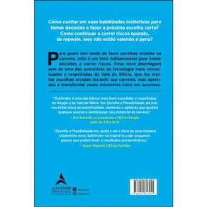 Como confiar em suas habilidades instintivas para tomar decisões e fazer a próxima escolha certa? Como continuar a correr riscos quando, de repente, eles não estão valendo a pena? Para quem tem medo de fazer escolhas erradas na carreira, este é um livro indispensável para tomar decisões e correr riscos. Essa nova abordagem vem de uma das executivas de tecnologia mais conceituadas e respeitadas do Vale do Silício, que fez muitas escolhas erradas durante a sua carreira, mas aprendeu como transformar esses momentos ruins em sucessos. “Sukhinder é uma das líderes mais bem-sucedidas e respeitadas do Google e do Vale do Silício. Em Escolha a Possibilidade , ela traz seu estilo único de autenticidade, otimismo e agitação ajudará qualquer pessoa a desbloquear seu potencial de carreira.” — Eric Schmidt, ex-presidente e CEO do Google, autor de A Era da IA “ Escolha a Possibilidade nos ajuda a ver o risco de uma maneira totalmente nova. Sukhinder irá inspirá-lo a dar pequenos passos que podem levar a resultados extraordinários.” — Susan Wojcicki, CEO do YouTube