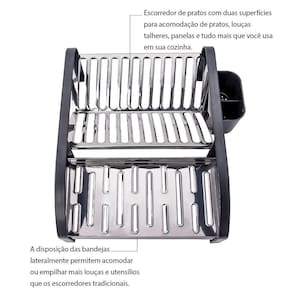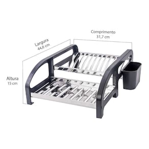 Escorredor de pratos com duas superfícies para acomodação de pratos, louças talheres, panelas e tudo mais que você usa em sua cozinha. Suas bandejas de acomodação ficam unidas lateralmente em bases de pp polipropileno na cor preta que deixam seu escorredor firme e com um design moderno. Acompanha porta talher em pp polipropileno que pode ser instalado nas duas laterais do escorredor. A disposição das bandejas lateralmente permitem acomodar ou empilhar mais louças e utensílios que os escorredores tradicionais. Bonito, prático e fácil de fácil limpeza. Altura: 15cm; Largura: 44,8cm; Comprimento: 31,7cm; Peso aprox. 0,980kg. Ean: 7898681710492