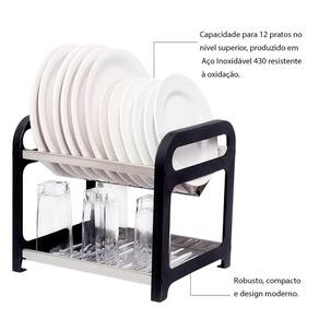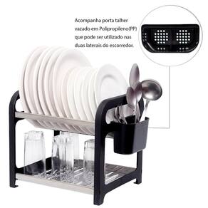 Escorredor 12 pratos Inox Preto com Porta Talheres Cor: Preto Escorredor 12 pratos Inox Preto com Porta Talheres. Escorredor de Pratos em Aço Inox com Laterais em PP Polipropileno super resistente. Acompanha Porta talher em PP Polipropileno que pode ser instalado nas duas laterais do escorredor. Robusto, compacto e de design moderno. Com formato retangular e capacidade para 12 peças, ele é feito em aço inox: mais resistente a corrosão. Disponha suas louças para secarem de forma prática e organizada Altura: 28,5cm;Largura: 26cm;Comprimento: 31,7cm;Peso Aprox. 1,000kg.