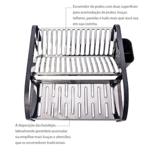 Escorredor de pratos com duas superfícies para acomodação de pratos, louças talheres, panelas e utensílios.