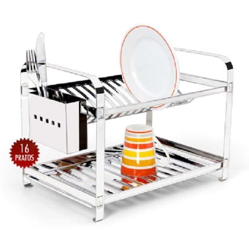 Deixe a sua cozinha mais limpa, higiênica e organizada com este Escorredor 16 Pratos. Com um visual super moderno e sofisticado, ele tornará as atividades do dia a dia como lavar a louça, mais práticas e ágeis, fazendo com que você gaste menos tempo e energia com elas para que possa aproveitar o tempo livre de outra forma. Dimensões aproximadas da embalagem (cm) AxLxP 30 x 28 x 41 Peso da embalagem 1,942 kg Material Inox Composição: 01 bandeja para pratos superior, 01 bandeja para copos inferior, 02 laterais em aço inox, 01 porta talheres em aço inox Garantia 90 dias contra defeitos de fabricação. Código do Fornecedor 8502M Código de barras 7896284285027