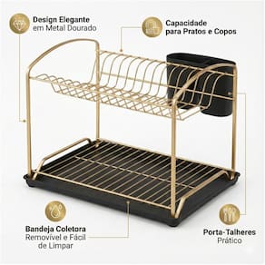 O Escorredor de Louças conta com uma estrutura em aço piatina (aço em formato achatado) que proporciona design diferenciado e traz beleza para cozinha. Possui 2 andares o que garante mais espaço para armazenar as louças, além de possuir porta talheres removível, com a bandeja que evita respingos indesejados auxilia na limpeza.