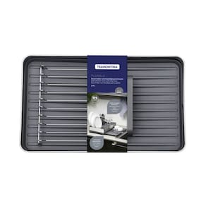 Nos dias em que o tempo é curto, o Escorredor de Louça Tramontina Plurale em aço inox e polipropileno com porta-talheres grafite garante praticidade e organização na sua cozinha. Compacto, mas eficiente, acomoda até 9 pratos, copos e talheres, com porta-copos expansível para otimizar o espaço. O porta-talheres em polipropileno se encaixa perfeitamente, enquanto as alças proporcionam segurança no manuseio. Seu design inclinado direciona a água para a bandeja coletora, que a leva direto para a pia, mantendo tudo seco e em ordem. Uma solução indispensável para rotinas corridas!
