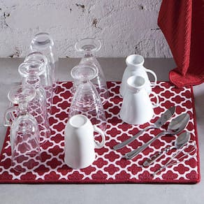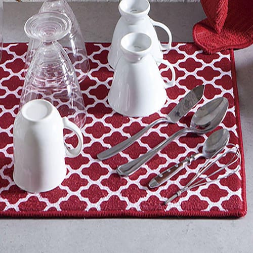 Existe no mercado uma espécie de tapete para louça, também conhecido como aparador de louças. É um tecido fofinho, semelhante àqueles colocados no banheiro, que absorve a água da louça. Use esse tapetinho em cima da mesa ou um balcão para colocar panelas, por exemplo.