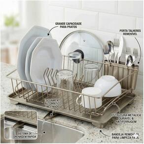 Escorredor de Louças amplo, com capacidade para 10 pratos, porta talheres plástico removível e espaço para copos e outros utensílios de cozinha, acompanha bandeja com bico escoador de água