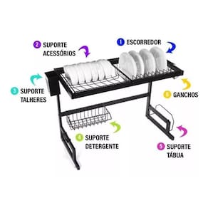 Facilita a organização na bancada da cozinha. Montagem sem necessidade de perfuração. Auto-sustentável, com apoio de pés para colocação na bancada da pia. Capacidade de carga de até 20kg. Pintura epóxi.