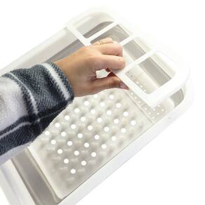 Escorredor de louças perfeito para eliminar a bagunça na pia e manter a cozinha organizada.Design retrátil que se ajusta a diferentes tamanhos de pia, economizando espaço quando não está em , ideal para cozinhas pequenas.Diversos espaços para armazenar copos, pratos e um suporte removível para talheres, garantindo uma secagem organizada.Feito com material de silicone durável e resistente, proporcionando durabilidade sem ferrugem e sendo compacto e fácil de limpar.Especificações: Material: Polipropileno e Silicone, Dimensões: Altura: 11,5cm x Largura: 36cm x Profundidade: 30cm, Peso: Aprox. 380g.Conteúdo: 01 Escorredor de Louças Dobrável de Silicone.