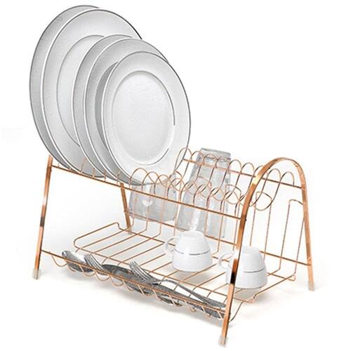 Quantidade: 1 unidade Tamanho: Comprimento 40,0 x Largura 27,0 x Altura 27,0 cm Modelo: Duplo Cor: Rose Gold Capacidade: 14 pratos Validade: Inderterminada Composição: aço galvanizado Atenção: não acompanha pratos, copos e nem talheres
