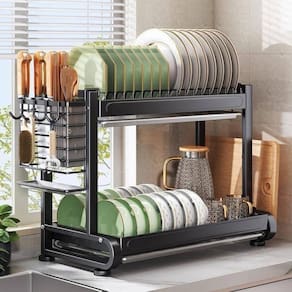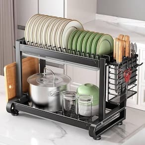 Com um design inteligente de dois andares, oferece amplo espaço para acomodar pratos, copos, xícaras, panelas, potes, tigelas e muito mais, garantindo que cada item tenha seu lugar específico para secagem eficiente e organizada.