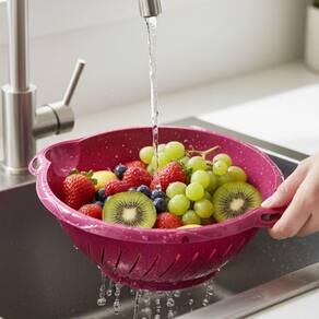 Fabricado em plástico resistente de alta qualidade, o escorredor garante durabilidade e segurança no uso diário. Seu design moderno com alças ergonômicas facilita o manuseio e o transporte, mesmo quando cheio. Compacto, mas espaçoso o suficiente para atender diversas preparações, ele é ideal para cozinhas de todos os tamanhos.