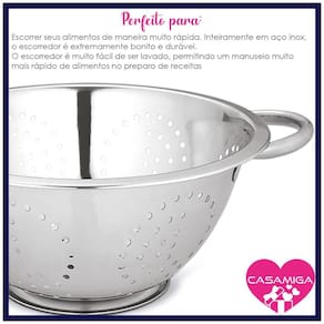 Ideal para uso no dia-a-dia, muito prático para auxiliar no preparo daquela deliosa macarronada ou higienizar legumes e verduras. Feito inteiramente em inox é fácil de higienizar, é atóxico, não altera o sabor dos alimentos, além de ser muito resistente.
