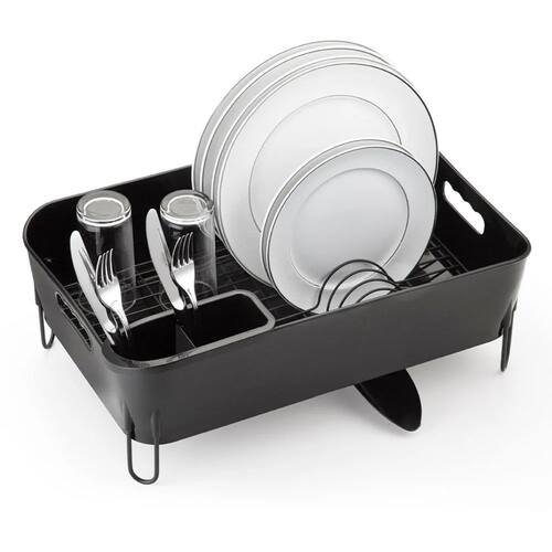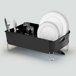Com design dobrável duplo de 2 andares em aço com pintura epóxi preta resistente à corrosão, acomoda até 16 pratos, possui porta-talheres integrado e suporte para copos, facilitando a secagem rápida sem ocupar espaço excessivo na pia.