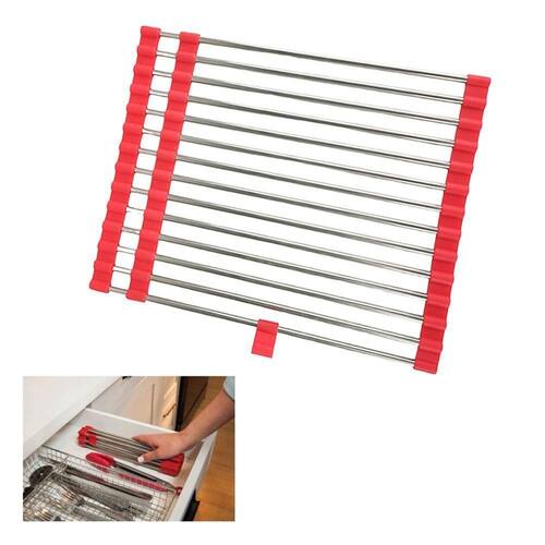 O Escorredor Esteira serve para escorrer água de alimentos ou louças. Basta desenror e colocar sobre a pia, para escorrer legumes e hortaliças que foram lavadas, peças de louças e até apoiar panelas e refratários quentes, servindo de base na mesa. O escorredor é feito em inox e silicone flexível, produto duradouro, pratico, fácil de limpar e guardar.