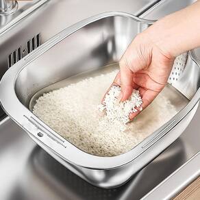 Projetado com um formato inclinado inovador, este utensílio de cozinha multifuncional permite escorrer arroz, frutas, legumes, verduras de forma eficiente. E possui um furo, possibilitando pendurá-lo para armazenamento, economizando espaço valioso na bancada e melhorando a organização da cozinha.