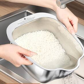 Projetado com um formato inclinado inovador e um gancho embutido, este utensílio de cozinha multifuncional permite escorrer arroz, frutas, legumes, verduras de forma eficiente. E possui um furo, possibilitando pendurá-lo para armazenamento, economizando espaço valioso na bancada e melhorando a organização da cozinha.