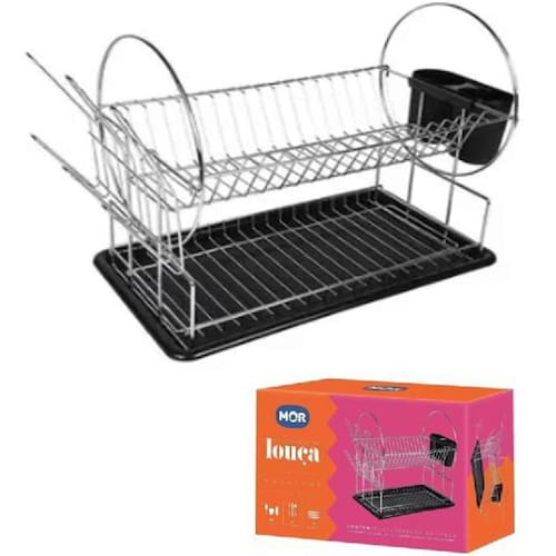 Escorredor Loucas 19 Pratos 6 Copos Maggiore Mor 2 Andares Completo e muito prático, o Escorredor de Louças 19 Pratos Maggiore é sinônimo de organização. Com dois andares muito bem distribuídos, possui divisória para os copos, talheres e pratos, além de outros utensílios domésticos que podem ser acomodados no primeiro andar. Conta com uma bandeja removível na parte inferior para garantir que a água se concentre apenas neste recipiente, mantendo a cozinha sempre limpa. Desenvolvido em aço cromado e polipropileno na cor preta, é leve e muito resistente, proporcionando modernidade a sua cozinha. Tem capacidade para até dezenove pratos, trinta e oito talheres e seis copos. Um utensílio de qualidade para facilitar ainda mais o seu dia. Especificações Material: Polipropileno Cor: Preto : 90 dias Altura: 34 cm Largura: 23,50 cm Comprimento: 48,50 cm Peso: 1,21 kg Observações: Os objetos que ambientam as imagens não acompanham o produto.