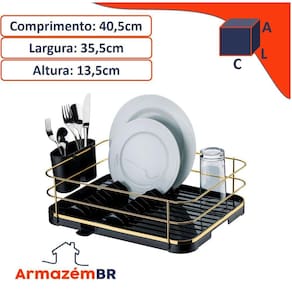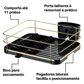 ESCORREDOR DE LOUÇAMarca: FutureCódigo: 983DDAcabamento/cor: Preto/Douradoescorredor de louça perfeito para deixar na pia de sua cozinhapossui bico fixo para vazão de água (não é possível trocar de lugar)porta talheres removívelpossuí capacidade para até 11 pratos, copos e talheresacabamento em plástico e aço carbono garantem resistência e durabilidadetecnologia Rust Free (maior cobertura contra corrosão)DESCRIÇÃO DO PRODUTO:O Escorredor de Louças possui bico fixo para vazão da água. Você direciona essa saída de água para dentro da cuba e a pia fica sempre seca. Tem capacidade para 11 pratos e um porta talheres removível, que pode ser posicionado onde for mais conveniente. É fabricado em plástico e aço carbono, com detalhe em aço piatina cromado (aço em formato achatado).Além do tradicional tratamento superficial da Future - onde são aplicadas até 4 camadas de metal - os produtos são revestidos com uma camada extra do protetivo especial Rust Free, garantindo cores vivas e brilhantes, além de maior resistência contra ferrugem.ESPECIFICAÇÕES TÉCNICAS:- Material da base: Plástico- Material da estrutura: Aço Carbono- Capacidade: 11 pratos- Linha: OriginaleDIMENSÕES E PESO:- Medidas: 40,5cm (C) x 35,5cm (L) x 13,5cm (A)- Peso: 1,096KgDICAS DE USO:- Para limpeza periódica recomenda-se o uso de um pano macio, água e sabão neutro.- Nunca utilize materiais abrasivos, lã de aço, esponjas ásperas, solventes ou produtos químicos corrosivos (cloro, água sanitária).ITENS INCLUSOS:01 - Escorredor De Louça DouradoNão acompanham os objetos que decoram o produto.As fotos, textos e layout aqui veiculados são de propriedade da Loja. Proibida a veiculação sem nossa autorização.