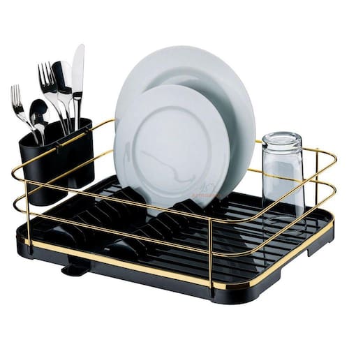 ESCORREDOR DE LOUÇAMarca: FutureCódigo: 983DDAcabamento/cor: Preto/Douradoescorredor de louça perfeito para deixar na pia de sua cozinhapossui bico fixo para vazão de água (não é possível trocar de lugar)porta talheres removívelpossuí capacidade para até 11 pratos, copos e talheresacabamento em plástico e aço carbono garantem resistência e durabilidadetecnologia Rust Free (maior cobertura contra corrosão)DESCRIÇÃO DO PRODUTO:O Escorredor de Louças possui bico fixo para vazão da água. Você direciona essa saída de água para dentro da cuba e a pia fica sempre seca. Tem capacidade para 11 pratos e um porta talheres removível, que pode ser posicionado onde for mais conveniente. É fabricado em plástico e aço carbono, com detalhe em aço piatina cromado (aço em formato achatado).Além do tradicional tratamento superficial da Future - onde são aplicadas até 4 camadas de metal - os produtos são revestidos com uma camada extra do protetivo especial Rust Free, garantindo cores vivas e brilhantes, além de maior resistência contra ferrugem.ESPECIFICAÇÕES TÉCNICAS:- Material da base: Plástico- Material da estrutura: Aço Carbono- Capacidade: 11 pratos- Linha: OriginaleDIMENSÕES E PESO:- Medidas: 40,5cm (C) x 35,5cm (L) x 13,5cm (A)- Peso: 1,096KgDICAS DE USO:- Para limpeza periódica recomenda-se o uso de um pano macio, água e sabão neutro.- Nunca utilize materiais abrasivos, lã de aço, esponjas ásperas, solventes ou produtos químicos corrosivos (cloro, água sanitária).ITENS INCLUSOS:01 - Escorredor De Louça DouradoNão acompanham os objetos que decoram o produto.As fotos, textos e layout aqui veiculados são de propriedade da Loja. Proibida a veiculação sem nossa autorização.