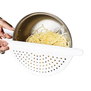 Escorredor Meia Lua Para Massas E Legumes Decor-Útil Branco Escorredor em formato de meia lua é ideal para escorrer macarrão, legumes, separar caldos e o que mais precisar. Fácil de usar, limpar e guardar. Cabe em qualquer armário com cabo para usar direto na panela, tigela ou em potes, com pinos na parte de trás que apoiam a borda da panela e furo na extremidade do cabo para pendurar. Pode ser guardado até na gaveta. Fabricado em material altamente resistente. Com o Escorredor Meia Lua Decor-Útil você terá mais praticidade e rapidez ao preparar suas refeições. Produto indispensável em qualquer cozinha. Cor: branco Medidas: 34,0 cm comp x 12,0 cm larg x 2,0 cm alt Material: plástico pp