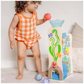 O Rollables Ocean Slide é um conjunto de brinquedos que inclui uma torre de rampa de madeira resistente, um funil removível e três Rollables um caranguejo simpático, um tubarão bobo e um incrível polvo com carrilhão. As crianças podem colocar os Rollables no funil removível e observá los cair pelo escorregador ondulado e sair pela boca da baleia. Além disso, podem girar a estrela do mar e pressionar o botão da baleia para parar e iniciar a ação. O conjunto também apresenta um labirinto de contas integrado que aumenta a emoção e a experiência tátil para as crianças.