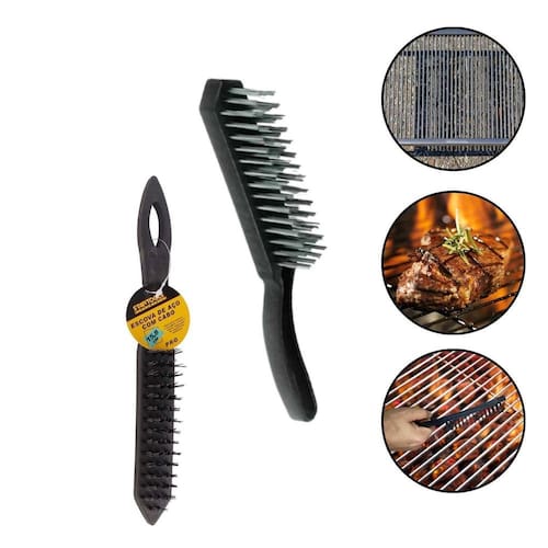 Especificações: - material: cerdas de aço inoxidável e cabo em plástico resistente. - cor: preto com detalhes em prata. - dimensões C x L x A : 26 x 3 x 3,5 cm. - altura das cerdas: 2 cm. - peso: aproximadamente 100 g.